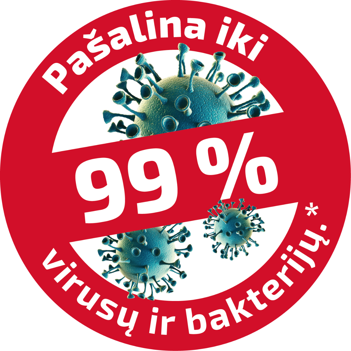 *Išbandyta su su modifikuotu „Ankara“ virusu ir stafilokoko bakterijomis, naudojant "Micro Duo" šluostę ir "Leifheit Power Cleaner" valiklį (25ml su 5l vandens, temperatūra 60 ° C).