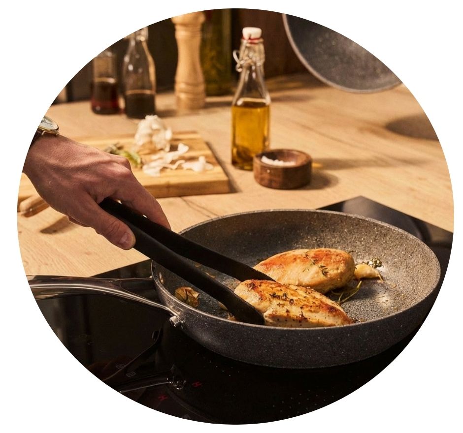 - Keptuvės korpusas su indukciniu pagrindu užtikrina greitą ir tolygų šilumos pasiskirstymą visoje keptuvėje