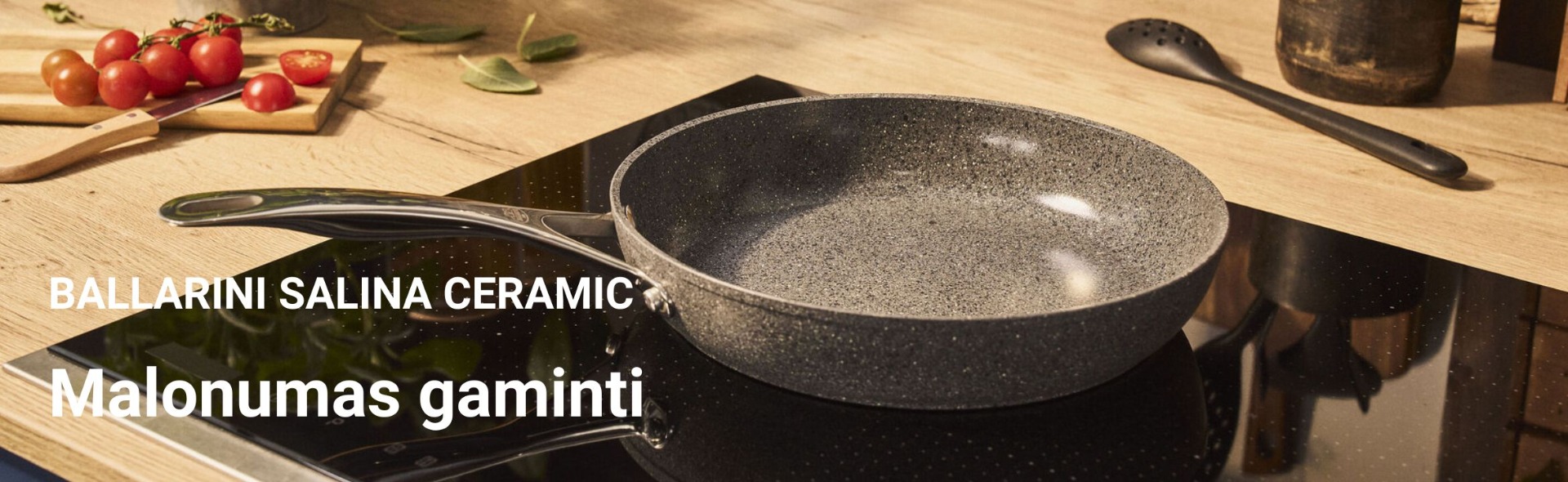 SALINA CERAMIC keptuvė pagaminta iš tvirto aliuminio su indukciniu pagrindu, užtikrinančiu greitą ir tolygų šilumos pasiskirstymą visame paviršiuje. CERAFORCE® Titanium keraminė nelipni danga, sustiprinta titano dalelėmis, leidžia gaminti sveikiau naudojant minimalų riebalų kiekį, o lygus paviršius yra lengvai valomas.